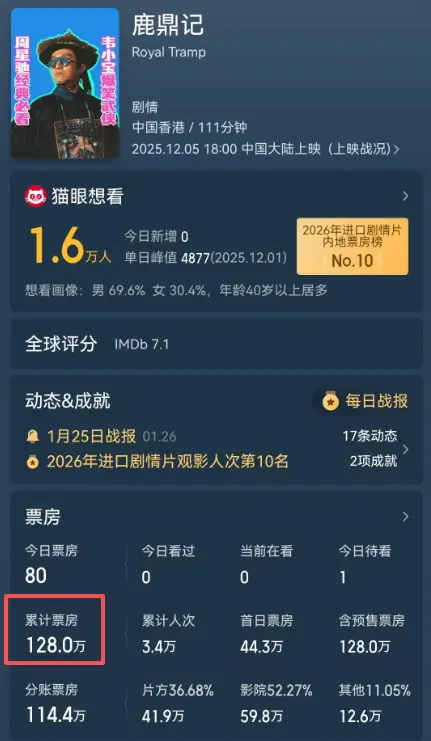 而有了“前车之鉴”,这次《鹿鼎记》的票房竟然才破120万。